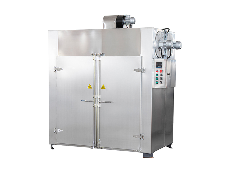 利用蒸汽或电为热源,用轴流风机对热交换器对流换热的方式加热空气,热空气气层经过烘盘与物料进行热量传透。新鲜空气从进风口进入烘箱进行补充,废湿热空气从排湿口排出,不断地补充新鲜空气与不断排出湿热空气,保持烘箱内适当的相对湿度,达到烘制的目的。