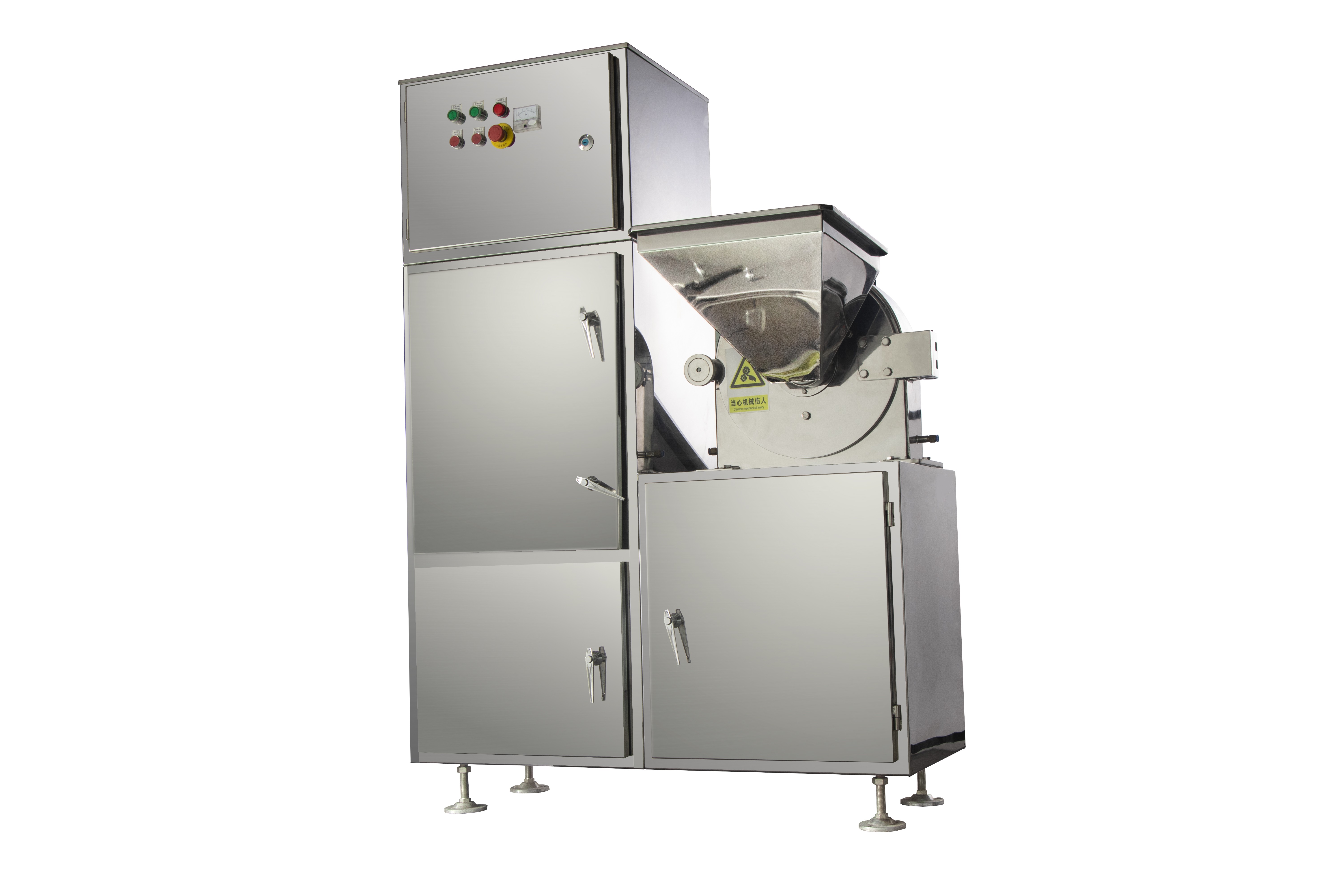 本机结构简单、坚固、运转平稳,粉碎效果好、噪音低、振动小、生产过程中无粉尘飞扬,被粉碎物可直接由主机磨腔中排出,粒度大小通过更换不同孔径筛网而控制。符合GMP要求。